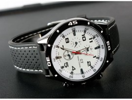 Ceas Quartz Sport Q008 Specificatii: Ceas de mana military-sport Model barbatesc Lungime curea: aproximativ 24 cm Diametru cadran : aproximativ 4.5 cm Latime curea: 2 cm Nu se recomanda expunerea in medii cu umiditate abundenta Material carcasa: otel inoxidabil Cadranele auxiliare nu sunt functionale, doar de design Culoarea cifrelor de pe cadran: albastru Material curea: silicon de foarte buna calitate comod si placut la atingere Cureaua este decorata de jur-imprejur cu cusatura albastra Culoarea curelei: neagra Mecanism: Quartz Miscare precisa